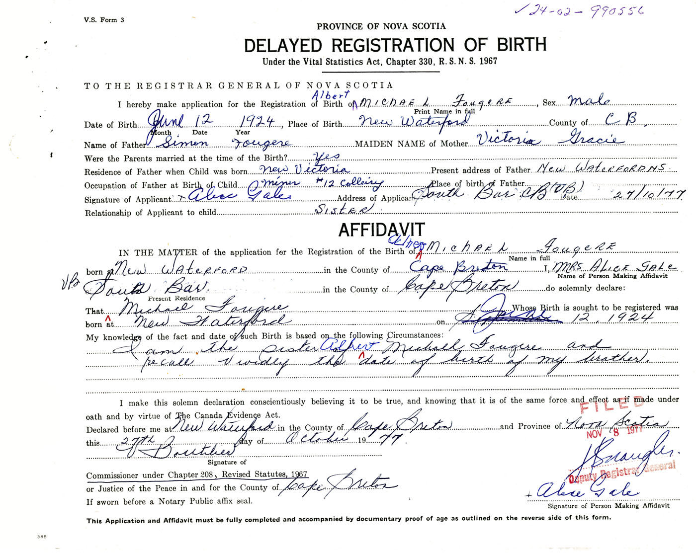I hereby make application for the Registration of Birth of Albert MichaelFougere Sex Male