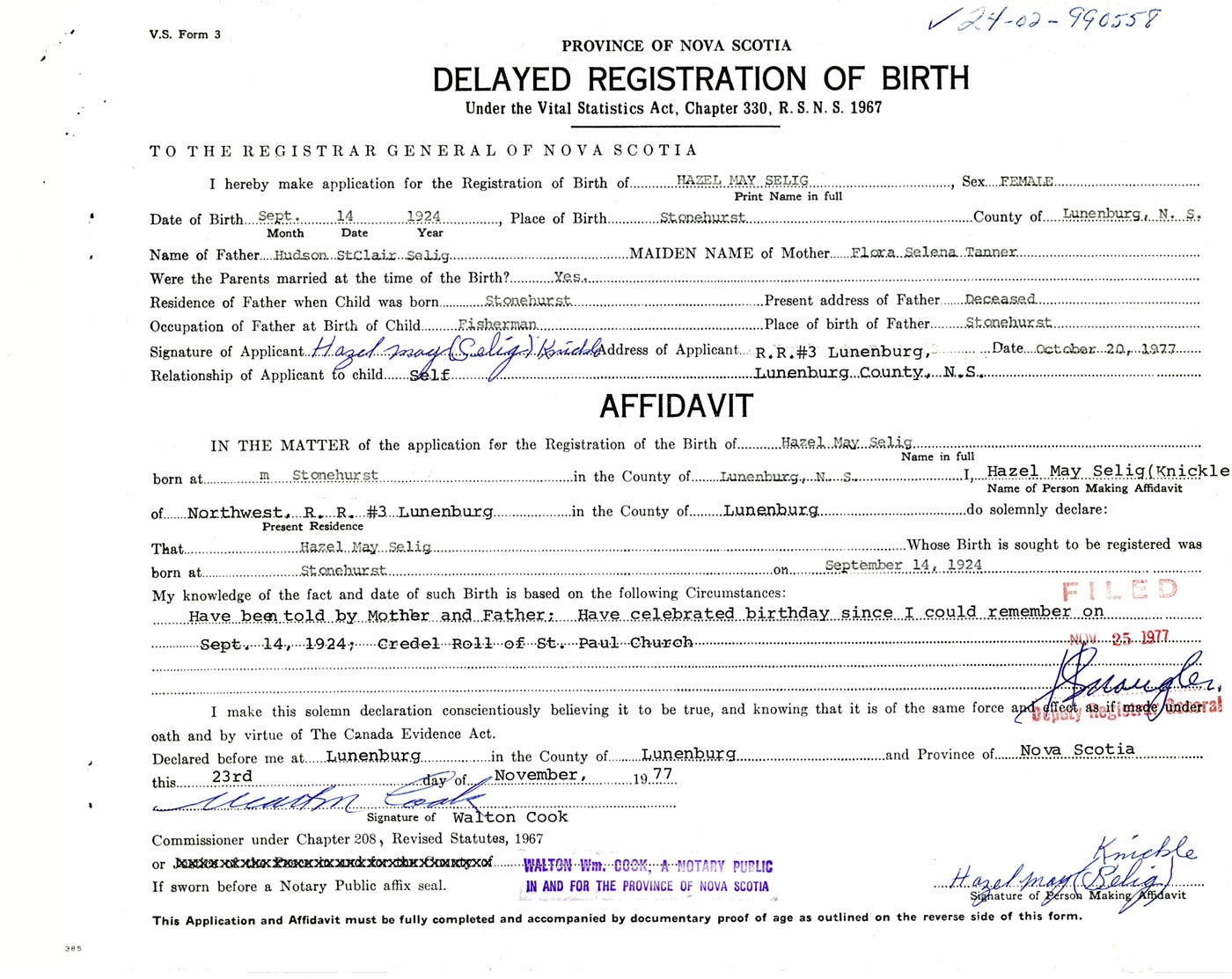 Signature of Applicant Hazel May (Selig) Knickle Address of Applicant RR #3. Lunenburg, Lunenburg Co., NS Date 20 October 1977