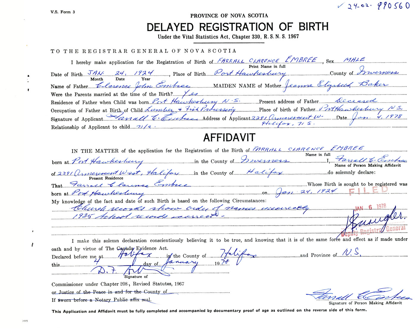 Signature of Applicant Farrall C. Embree Address of Applicant 2291 Armcrescent West, Halifax, NS Date 4 January 1978
