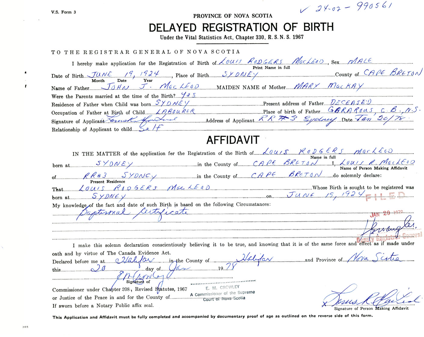 Signature of Applicant Louis R. MacLeod Address of Applicant RR #3, Sydney, Cape Breton Co., NS Date 20 January 1978