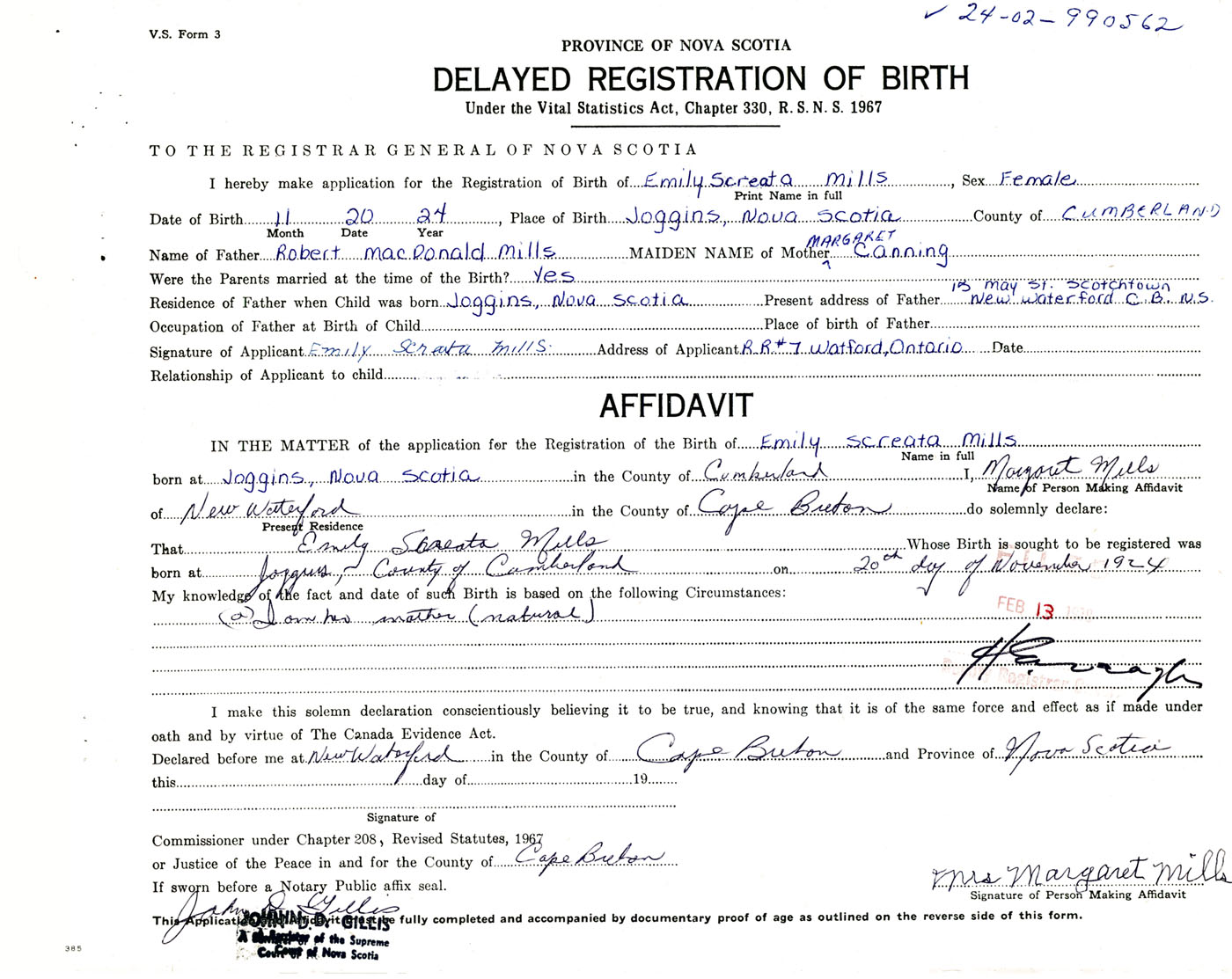 IN THE MATTER of the application for the Registration of the Birth of Emily ScreataMills