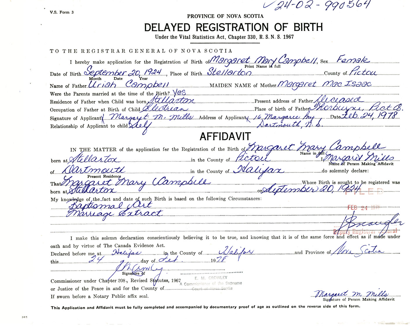 Signature of Applicant Margaret M. Mills Address of Applicant 16 Margaree Parkway, Dartmouth, NS Date 24 February 1978
