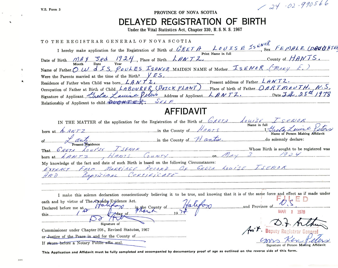 Signature of Applicant Greta Louise Peters Address of Applicant Lantz, Hants Co., NS Date 28 February 1978