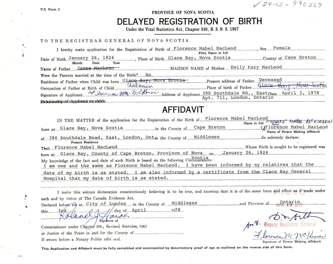I am one and the same as Florence Mabel MacLeod. I have been informed by my relatives that the date of my birth is as stated. I am also informed by a certificate from the Glace Bay General Hospital that my date of birth is as stated.
