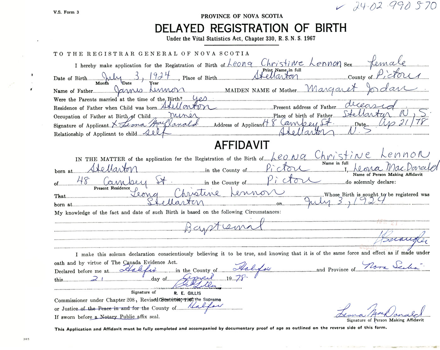 I hereby make application for the Registration of Birth of Leona ChristineLennon Sex Female