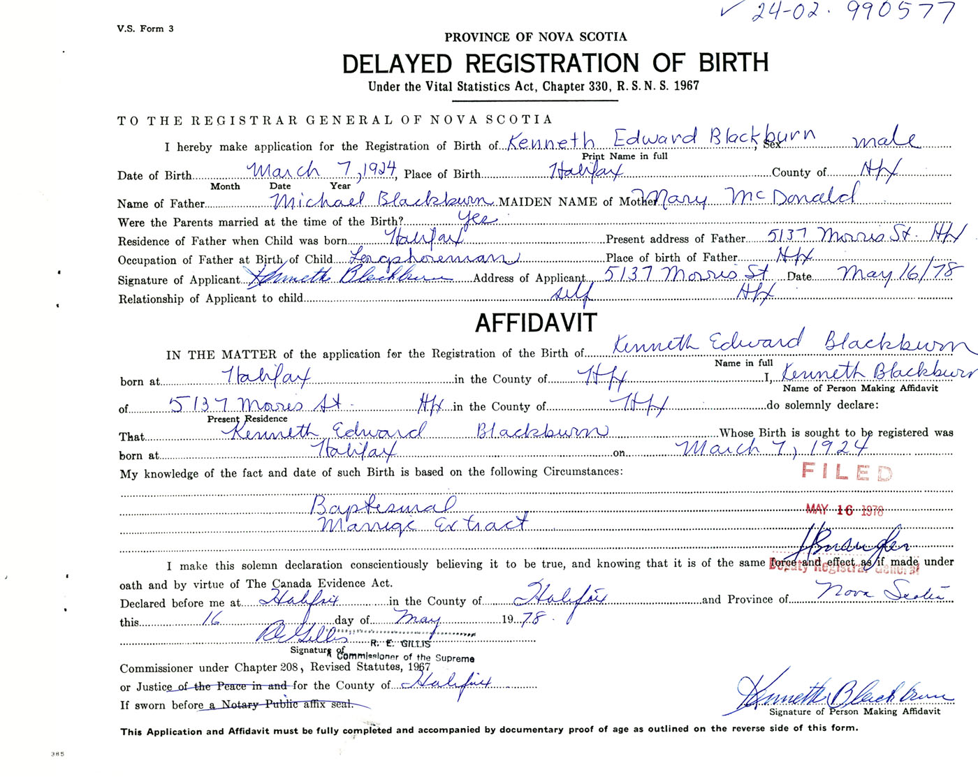 Signature of Applicant Kenneth Blackburn Address of Applicant 5137 Morris Street, Halifax, NS Date 16 May 1978