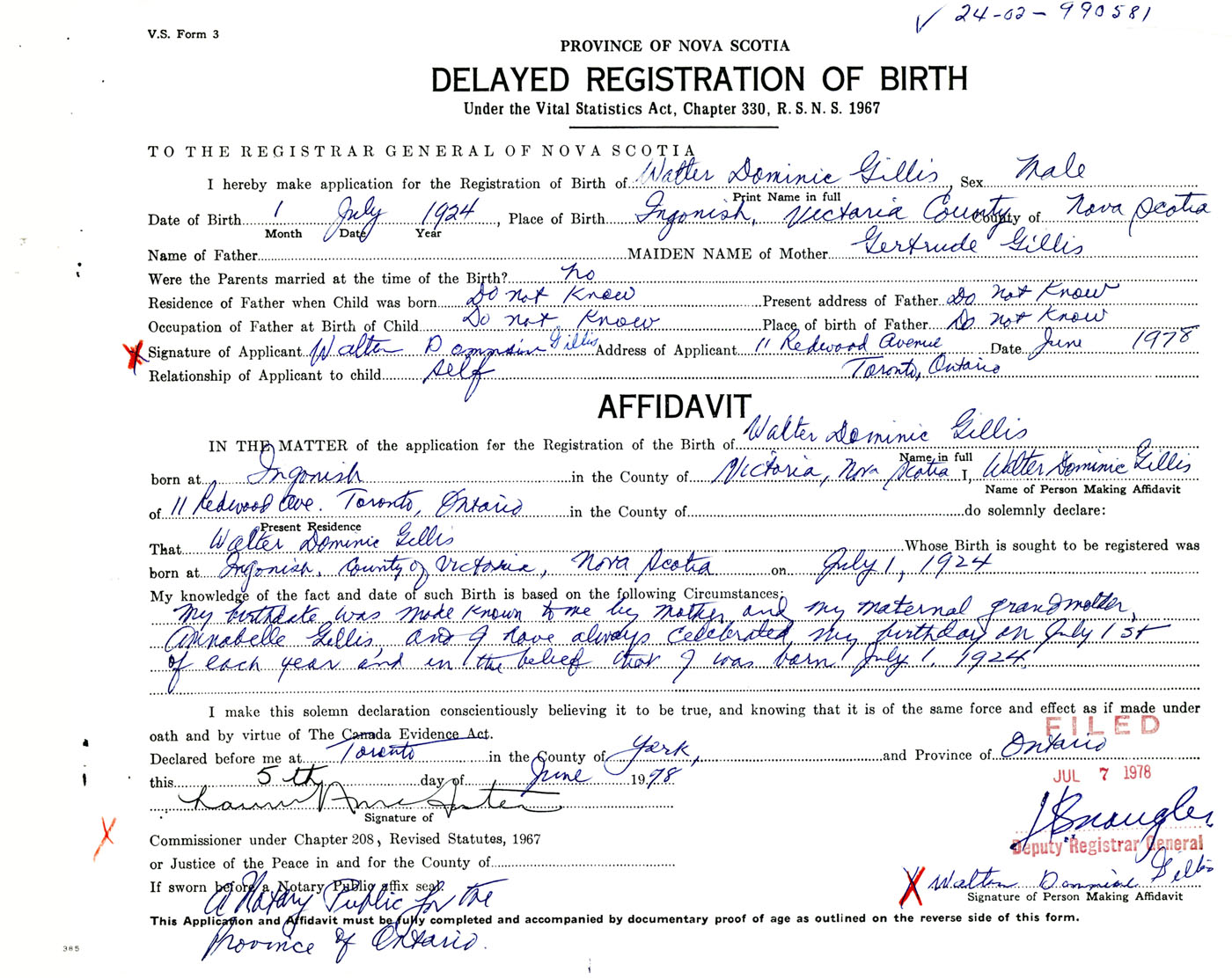 Signature of Applicant Walter Dominic Gillis Address of Applicant 11 Redwood Avenue, Toronto, Ontario Date June 1978