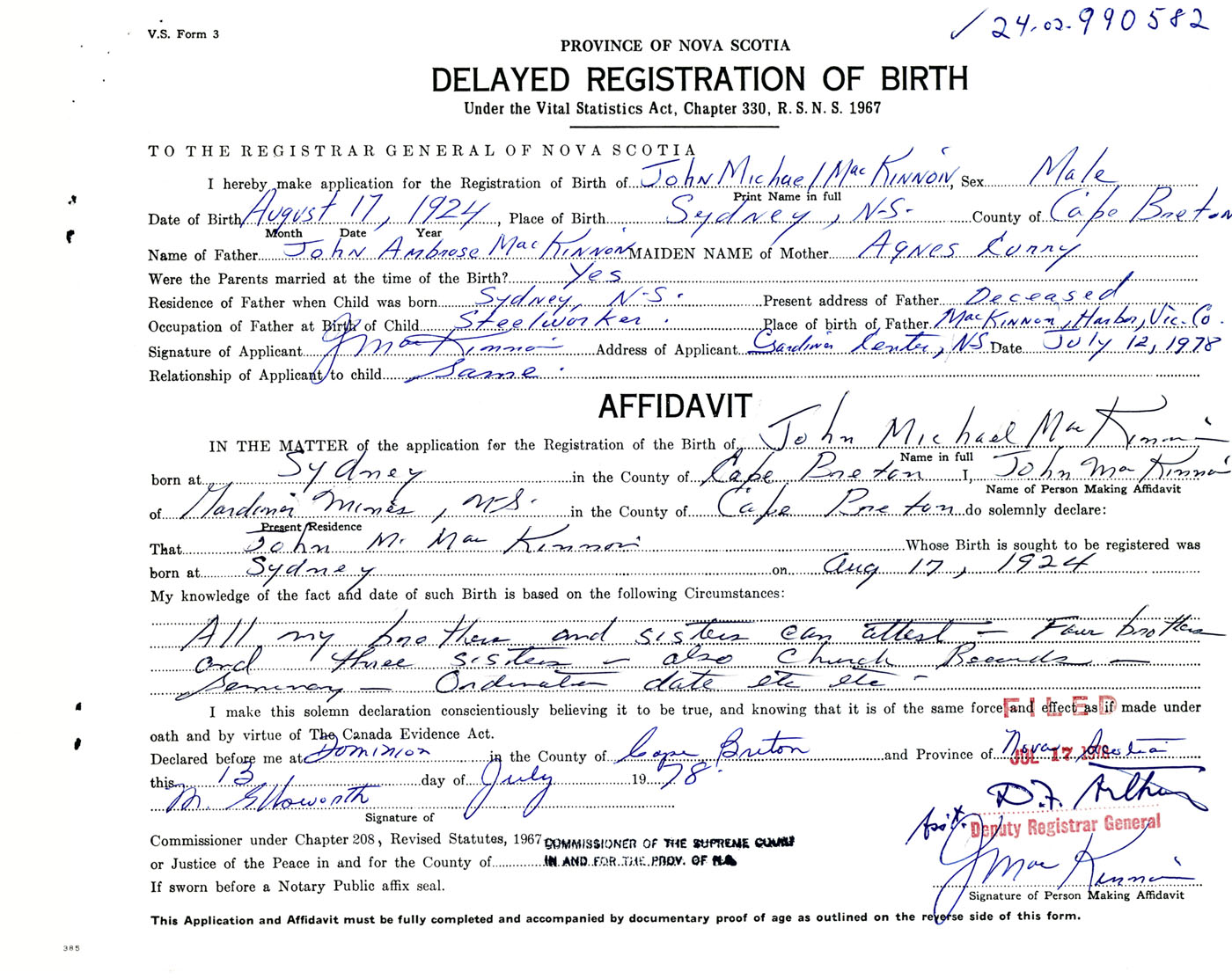 Signature of Applicant J. MacKinnon Address of Applicant Gardiner Centre, Cape Breton Co., NS Date 12 July 1978