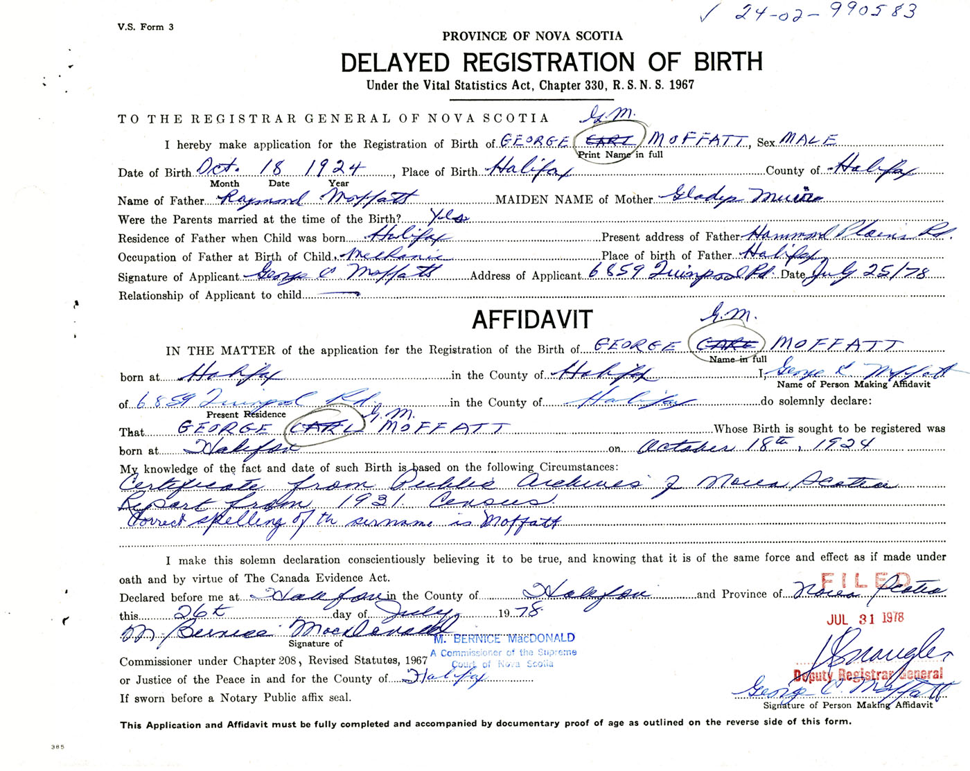 Certificate from Public Archives of Nova Scotia Report from 1931 census Correct spelling of the surname is Moffatt