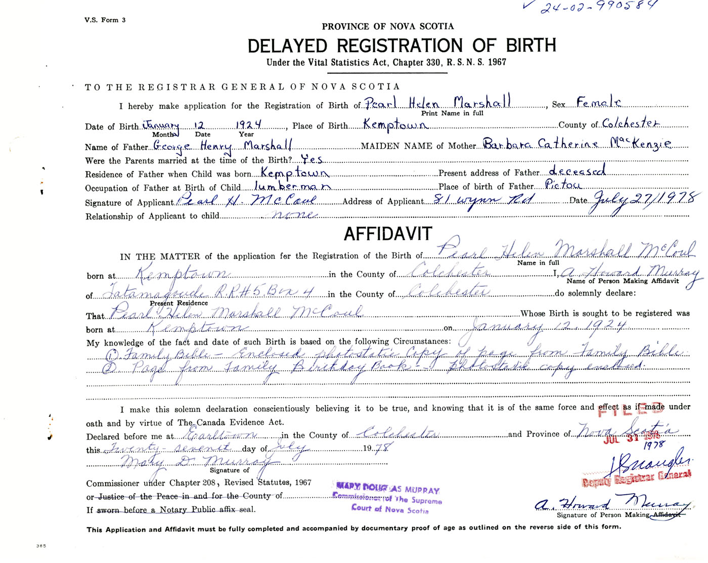 Signature of Applicant Pearl H. McCoul Address of Applicant 81 Wynn Road, Truro, Colchester Co., NS Date 27 July 1978