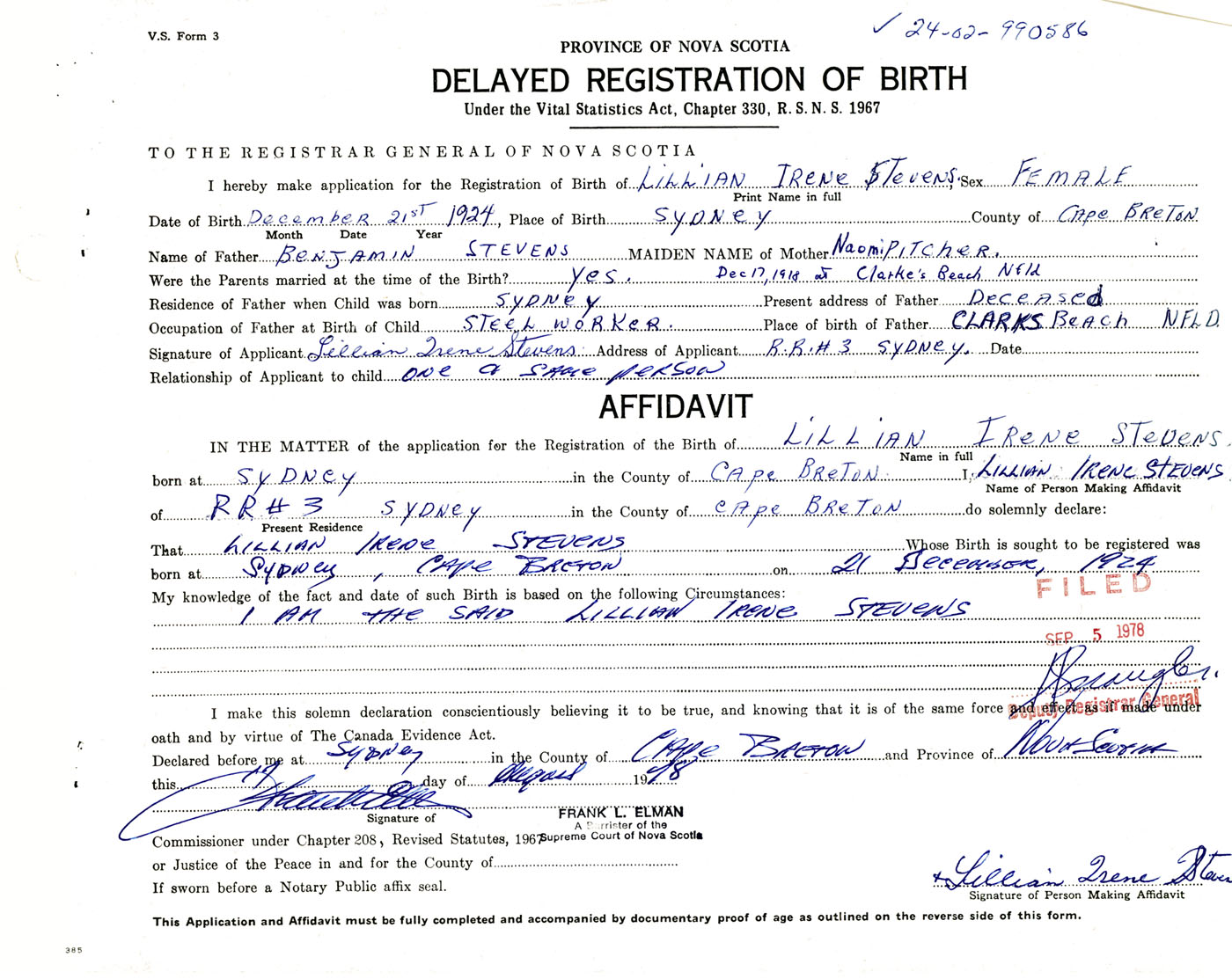 Signature of Applicant Lillian Irene Stevens Address of Applicant RR #3, Sydney, Cape Breton Co., NS Date August 1978