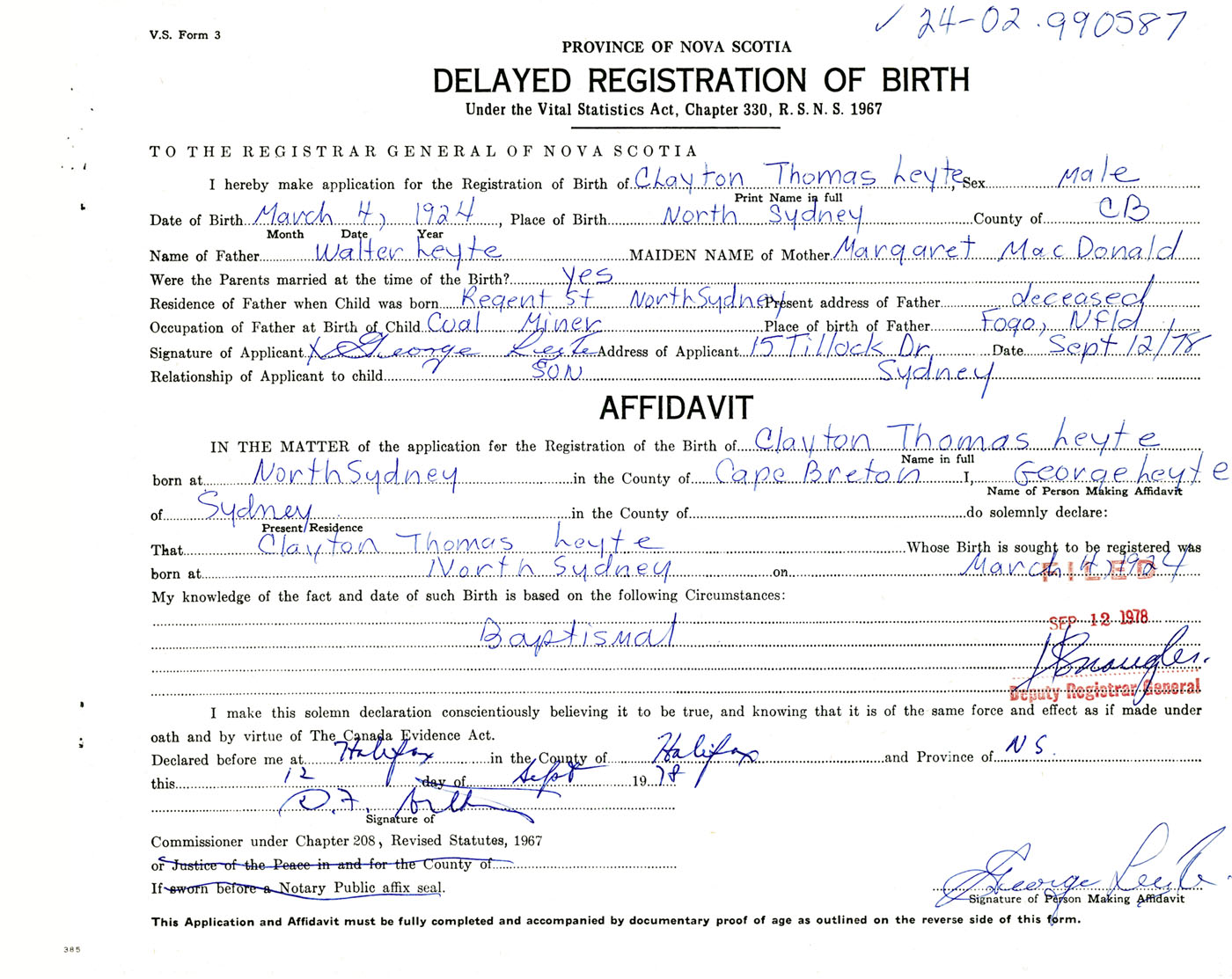 I hereby make application for the Registration of Birth of Clayton ThomasLeyte Sex Male
