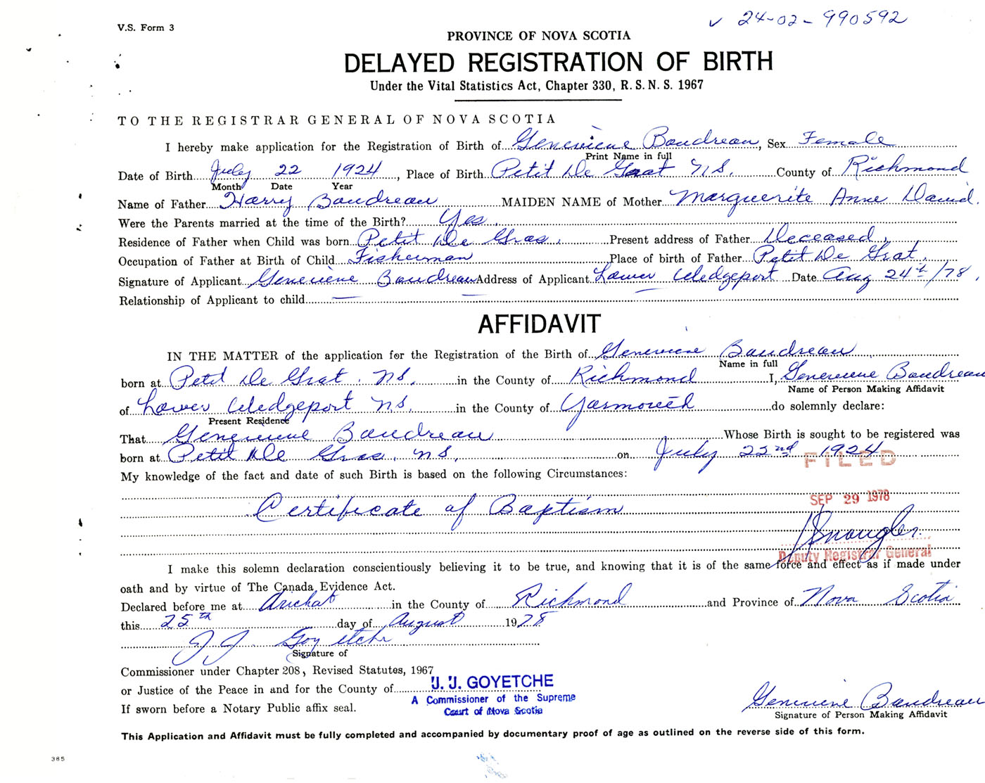 Signature of Applicant Genevieve Boudreau Address of Applicant Lower Wedgeport, Yarmouth Co., SN Date 24 August 1978