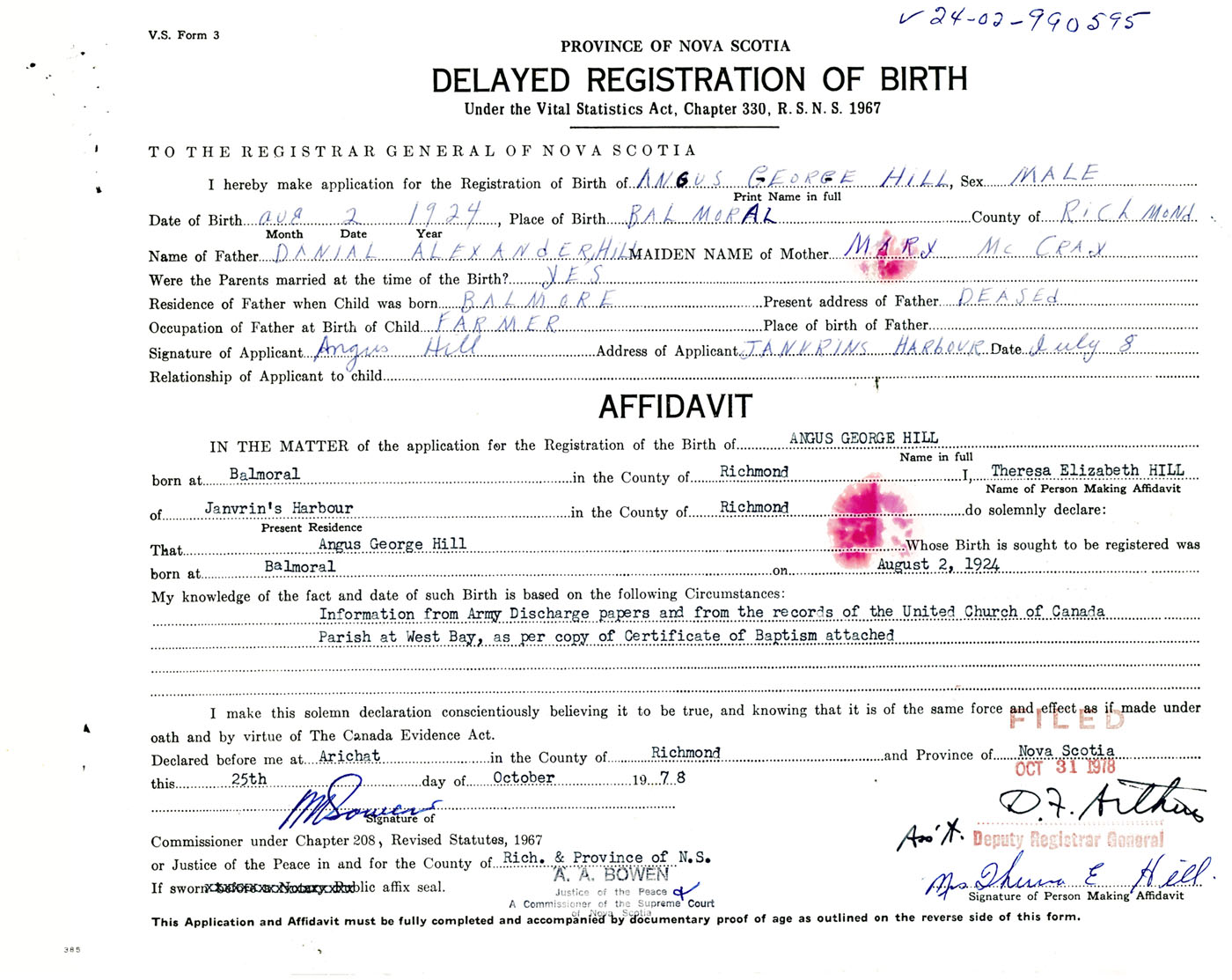 Residence of Father when child was born Balmoral, Richmond Co., NS Present address of Father Deceased
