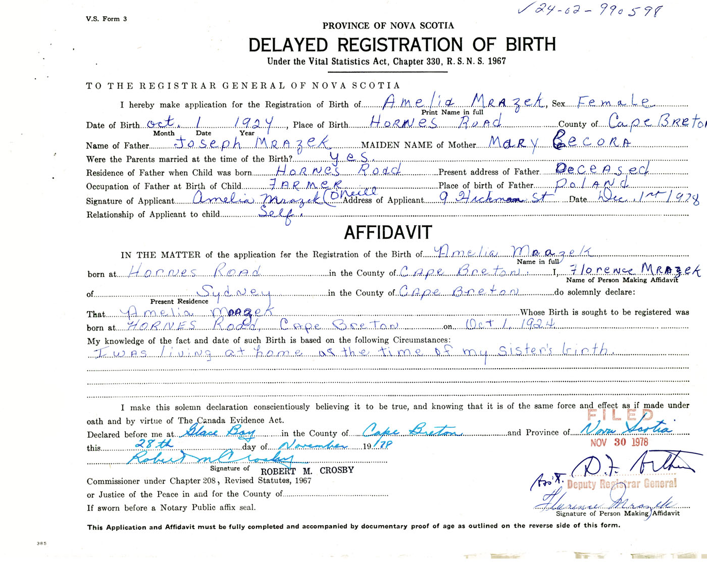 Signature of Applicant Amelia Mrazek (O'Neill) Address of Applicant 9 Hickman Street, Glace Bay, Cape Breton Co., NS Date 1 December 1978