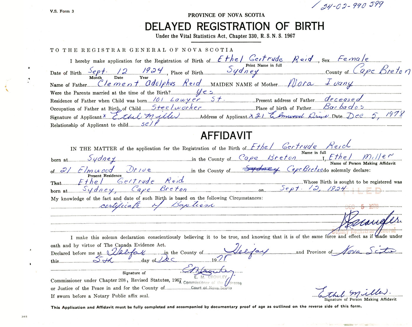 Signature of Applicant Ethel Miller Address of Applicant 21 Elmwood Drive, Sydney, Cape Breton Co., NS Date 5 December 1978