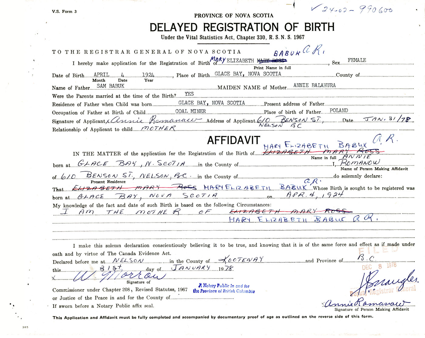 I hereby make application for the Registration of Birth of Mary ElizabethBabuk Sex Female