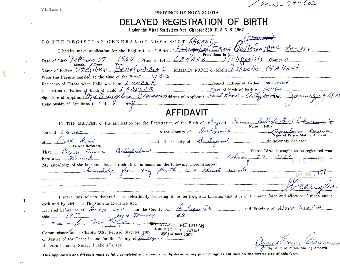 IN THE MATTER of the application for the Registration of the Birth of Evangeline Agnes EmmaBellefontaine