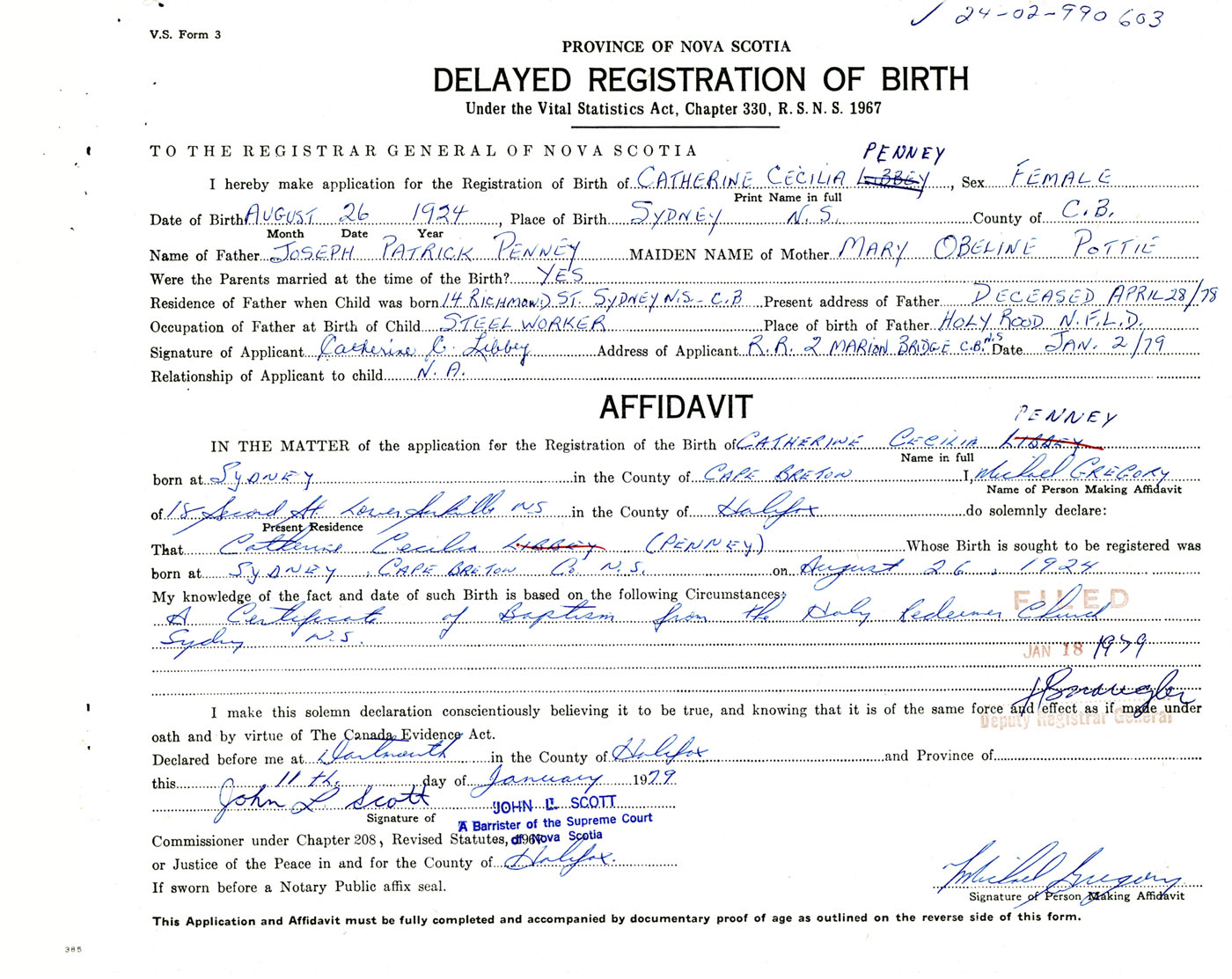 Name of Father Joseph Patrick Penney MAIDEN NAME of Mother Mary Obeline Pottie