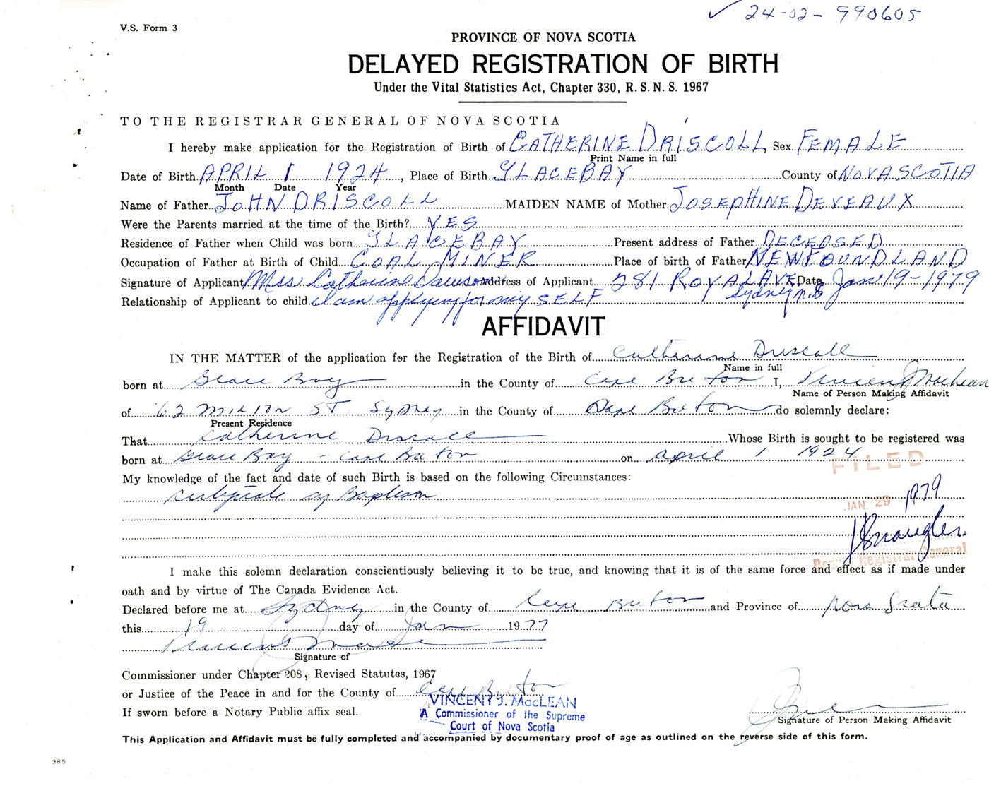 Name of Father John Driscoll MAIDEN NAME of Mother Josephine Deveaux
