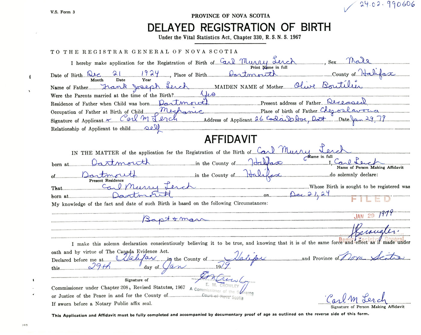 Signature of Applicant Carl M. Lerch Address of Applicant 26 Esdaile Avenue, Dartmouth, NS Date 29 January 1979