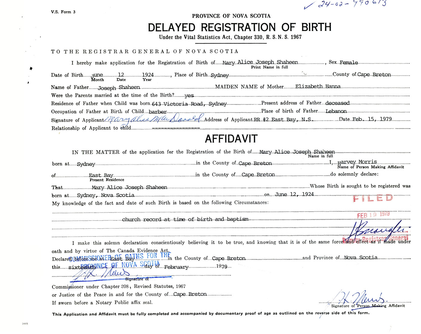 IN THE MATTER of the application for the Registration of the Birth of Mary Alice JosephShaheen