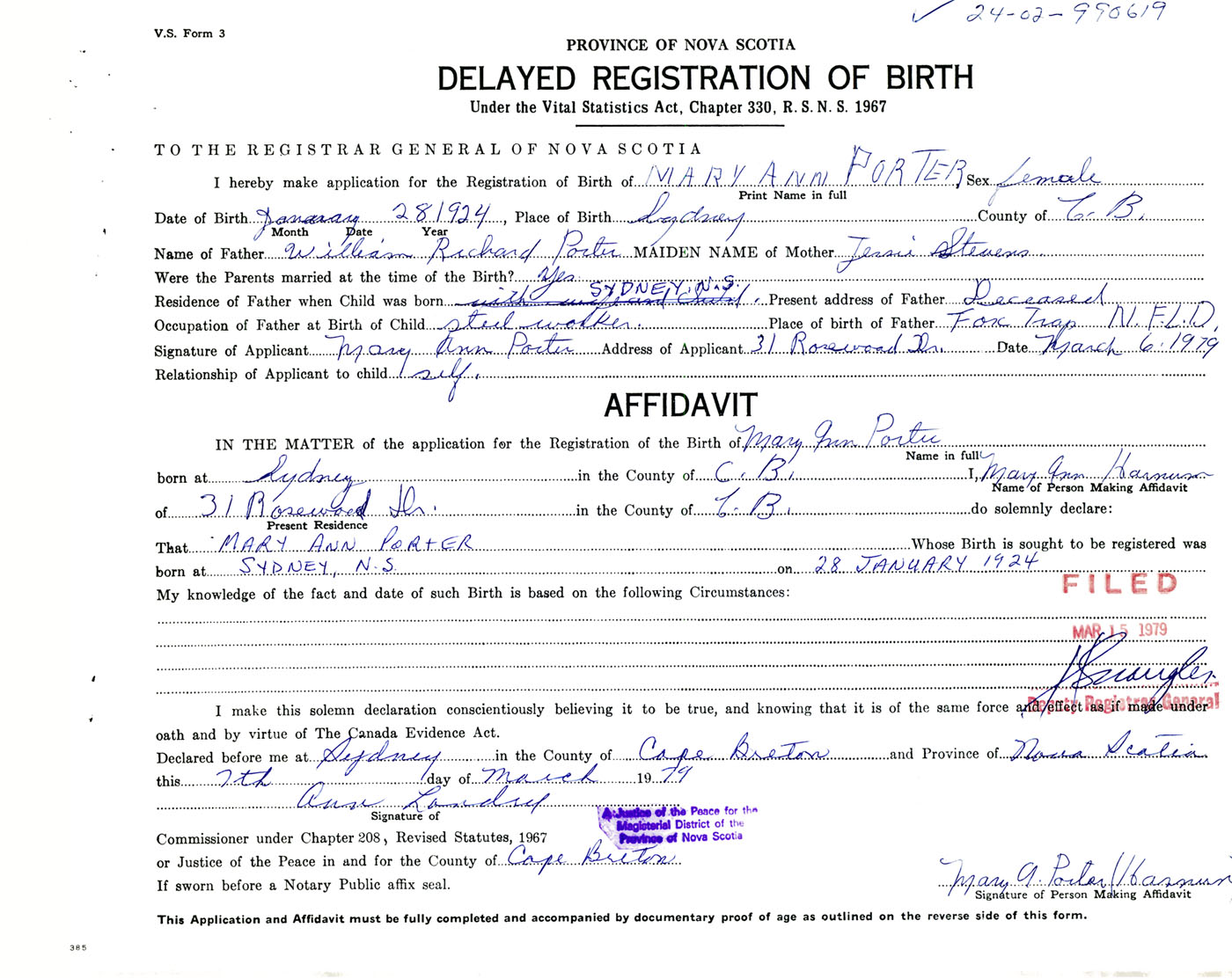 Signature of Applicant Mary Ann Porter Address of Applicant 31 Rosewood Drive, Sydney, Cape Breton Co., NS Date 6 March 1979
