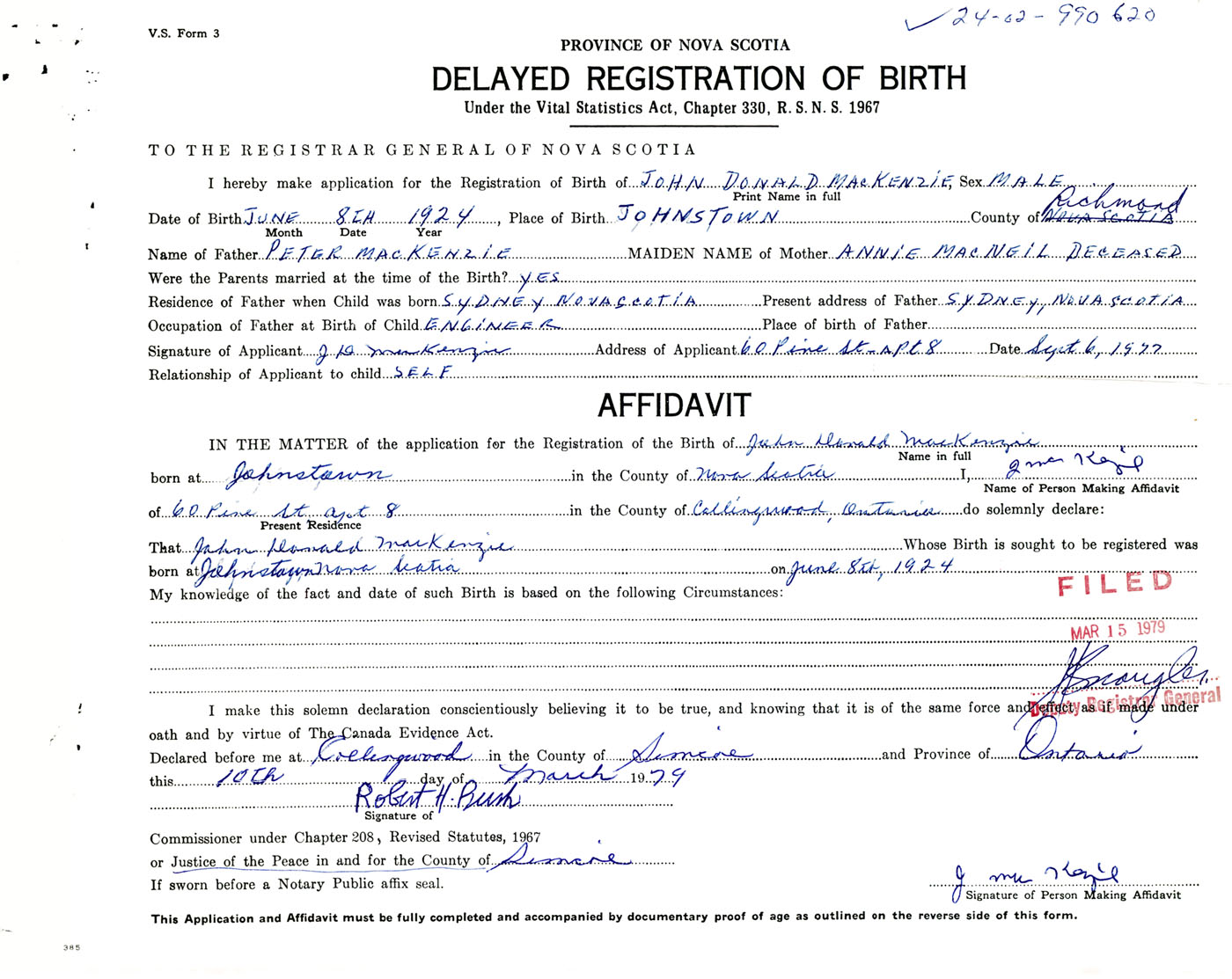 I hereby make application for the Registration of Birth of John DonaldMacKenzie Sex Male