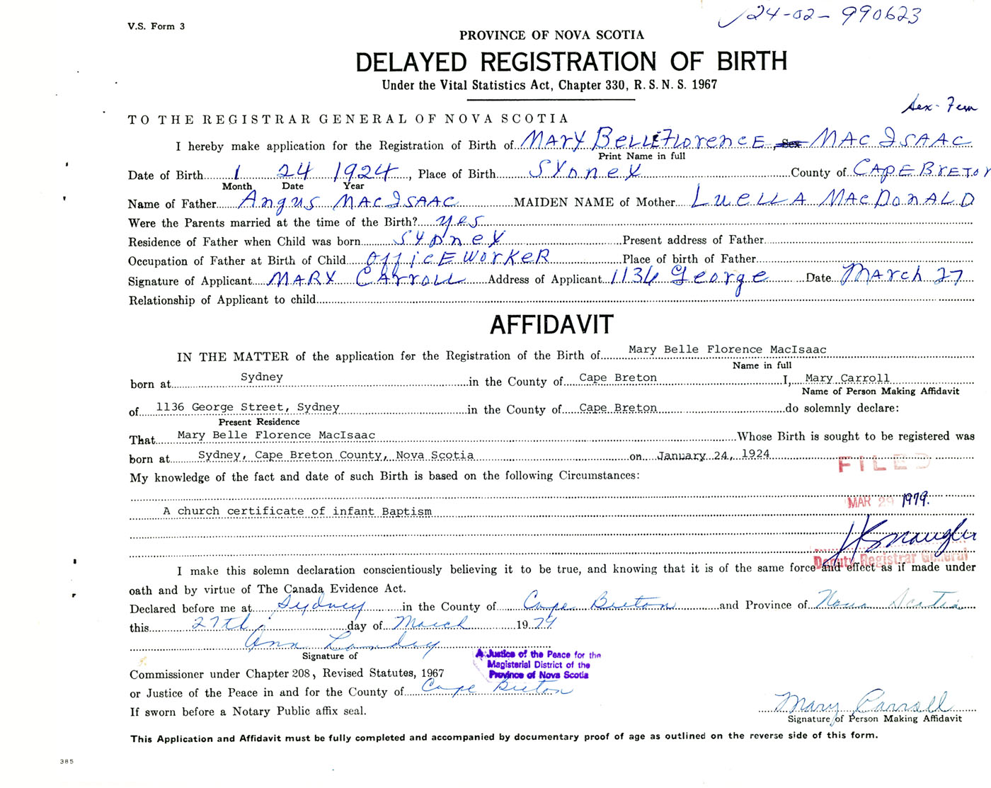 IN THE MATTER of the application for the Registration of the Birth of Mary Belle FlorenceMacIsaac