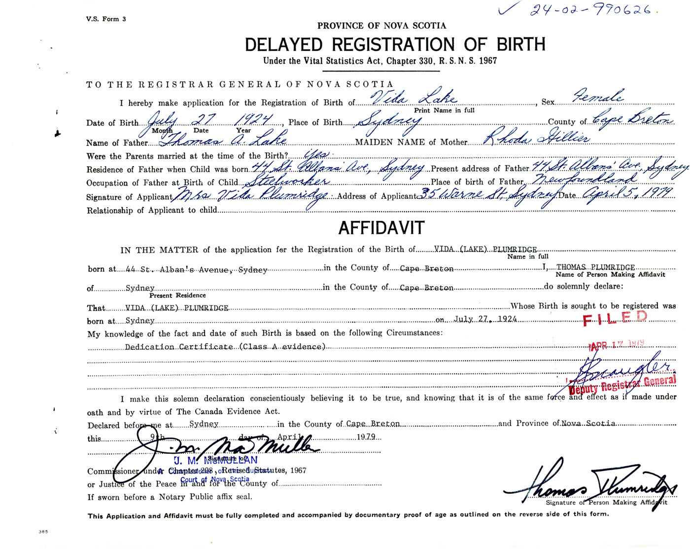 Signature of Applicant Mrs. Vida Plumridge Address of Applicant 35 Warne Street, Sydney, Cape Breton Co., NS Date 5 April 1979