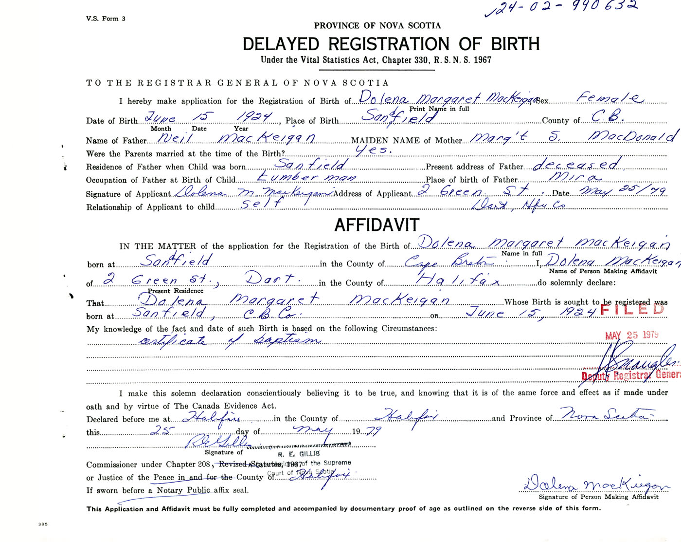 Signature of Applicant Dolena M. MacKeigan Address of Applicant 2 Green Street, Dartmouth, NS Date 25 May 1979