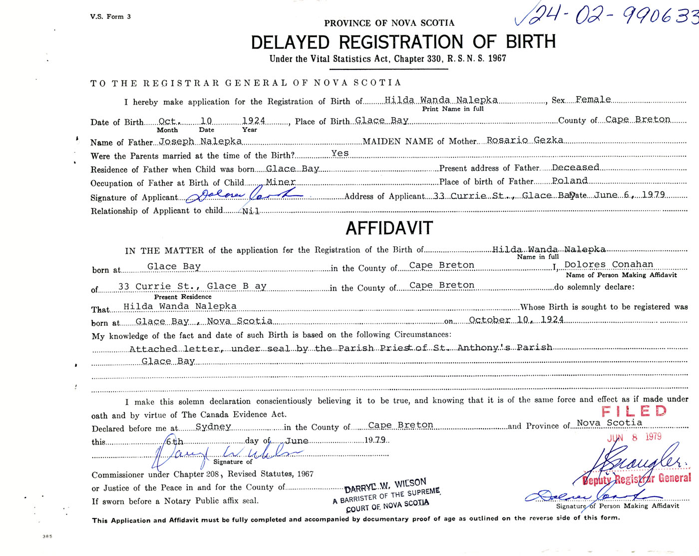 Signature of Applicant Dolores Conahan Address of Applicant 33 Currie Street, Glace Bay, Cape Breton Co., NS Date 6 June 1979