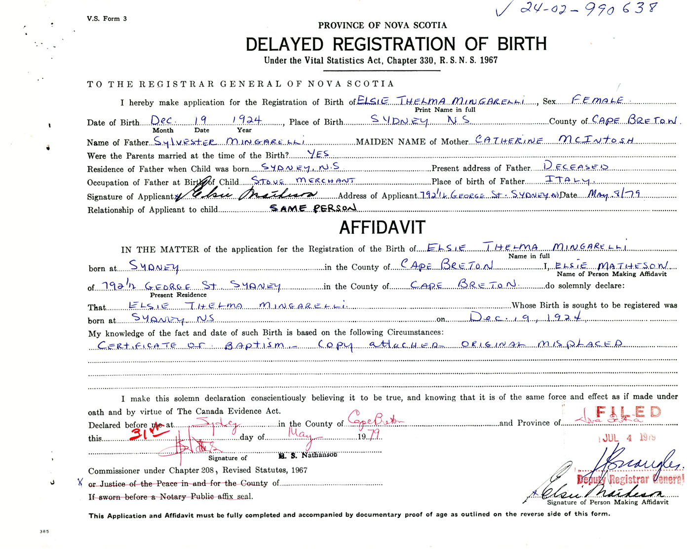 I hereby make application for the Registration of Birth of Elsie ThelmaMingarelli Sex Female