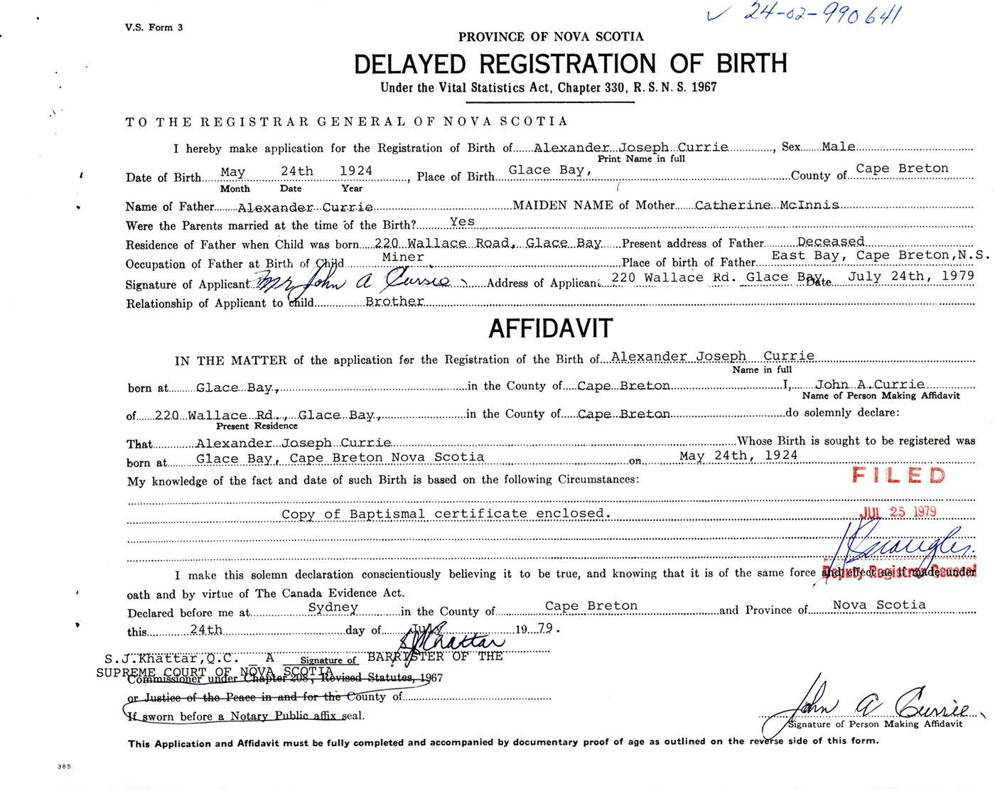 Signature of Applicant Mr. John A. Currie Address of Applicant 220 Wallace Road, Glace Bay, Cape Breton Co., NS Date 24 July 1979