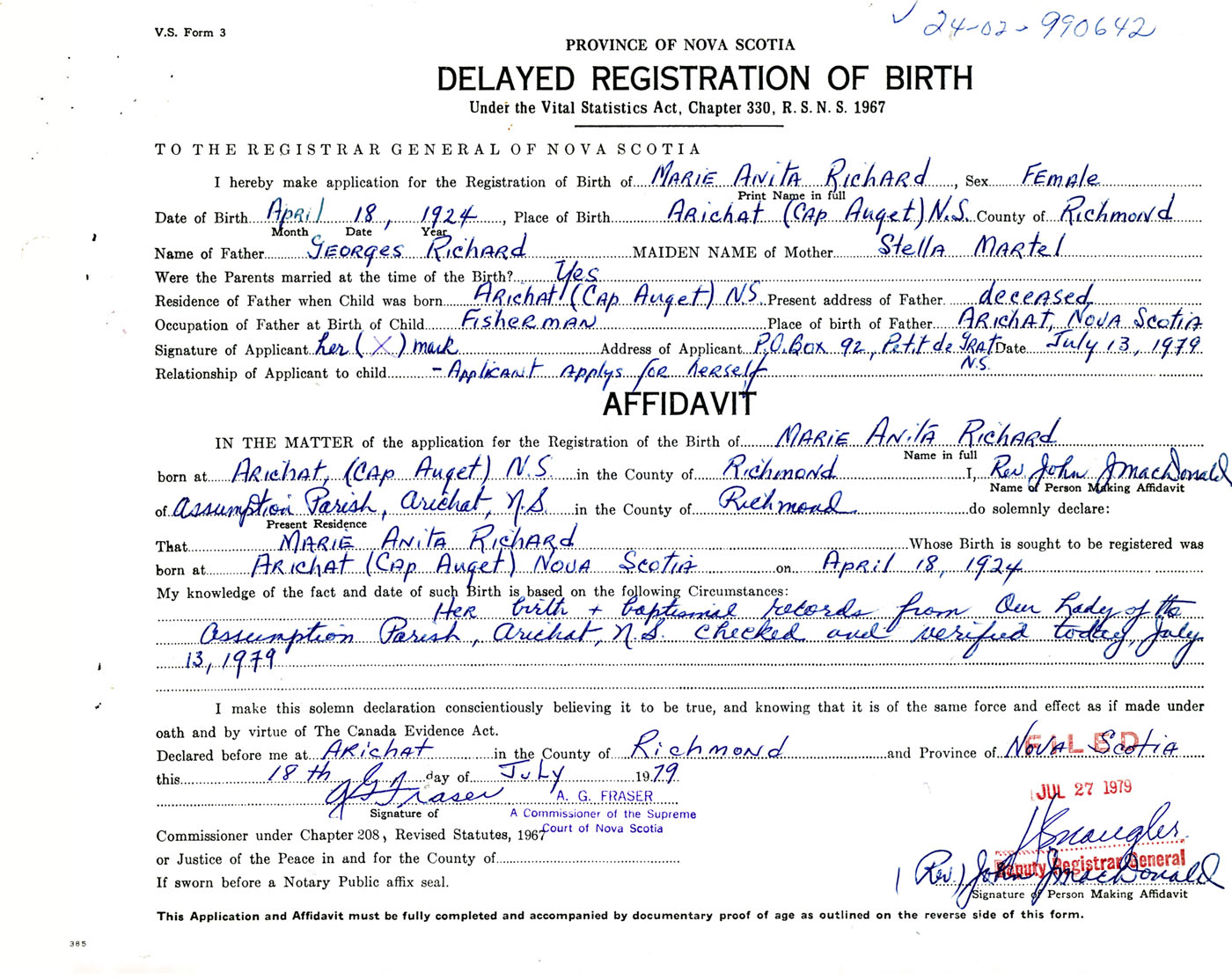 Signature of Applicant Marie Richard Address of Applicant PO Box 91, Petit de Grat, Richmond Co., NS Date 13 July 1979