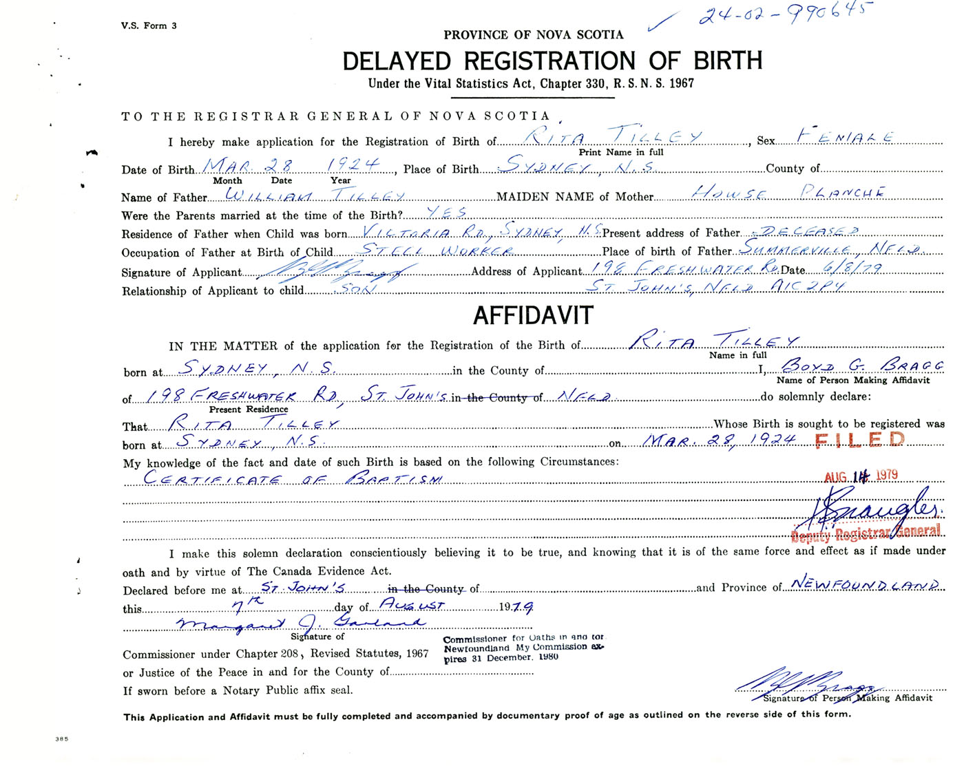 I hereby make application for the Registration of Birth of RitaTilley Sex Female