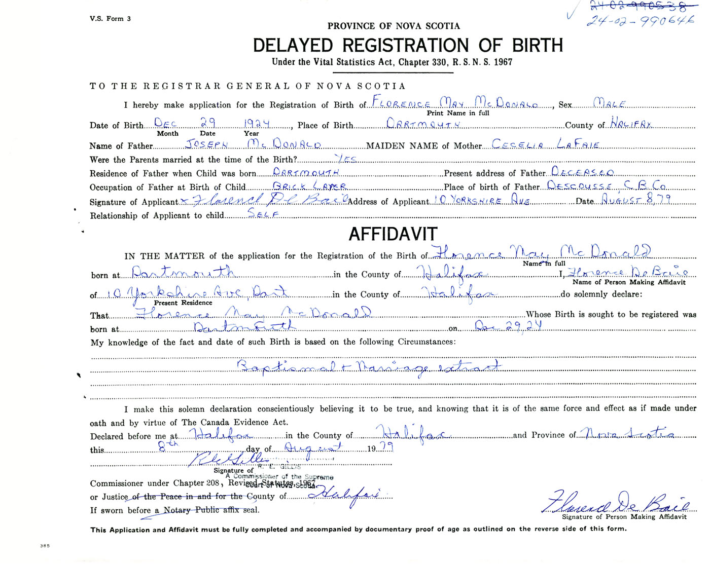 Date of Birth December 29, 1924 Place of Birth DartmouthCounty of Halifax