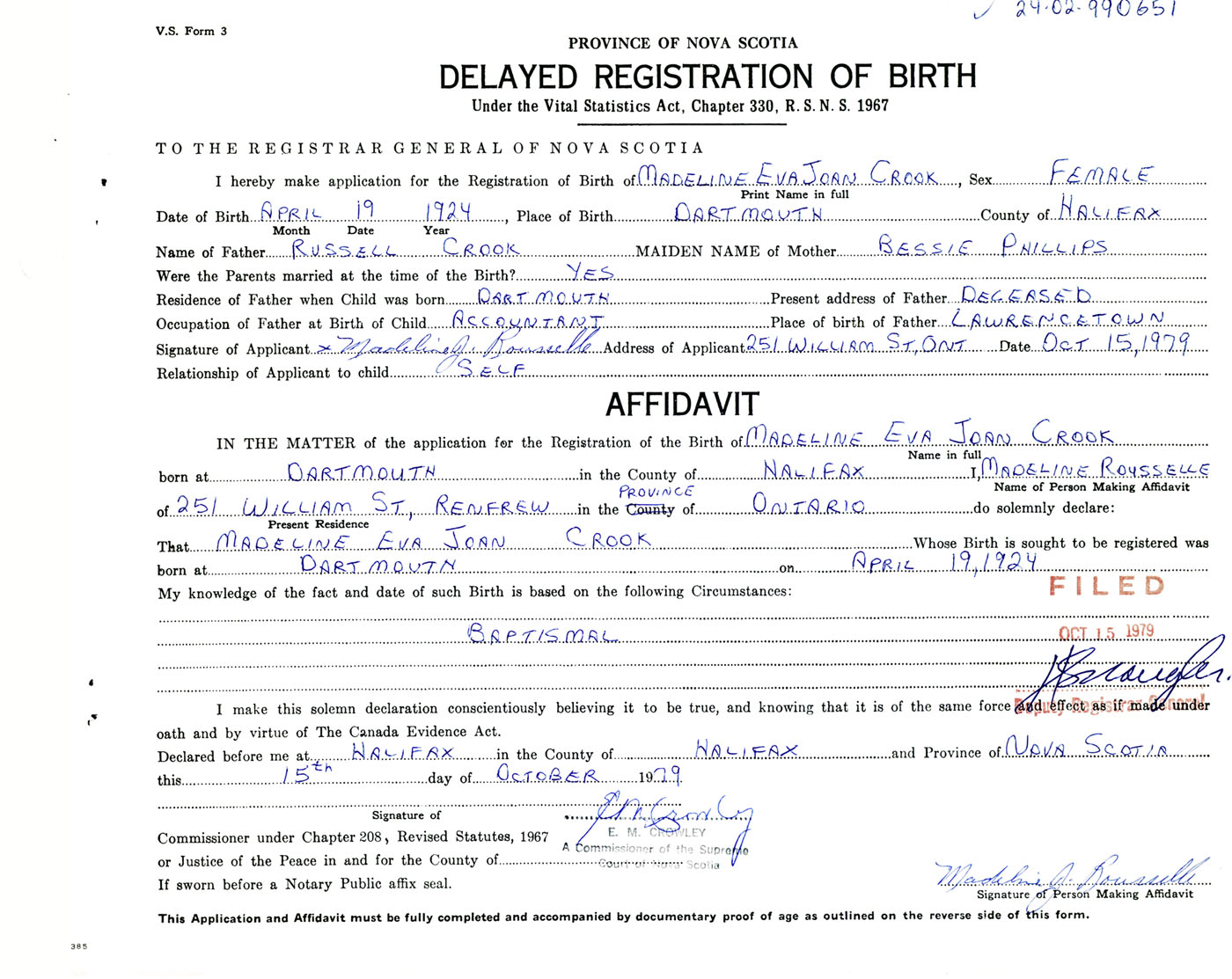 Signature of Applicant Madeline J. Rousselle Address of Applicant 251 William Street, Renfrew, Ontario Date 15 October 1979