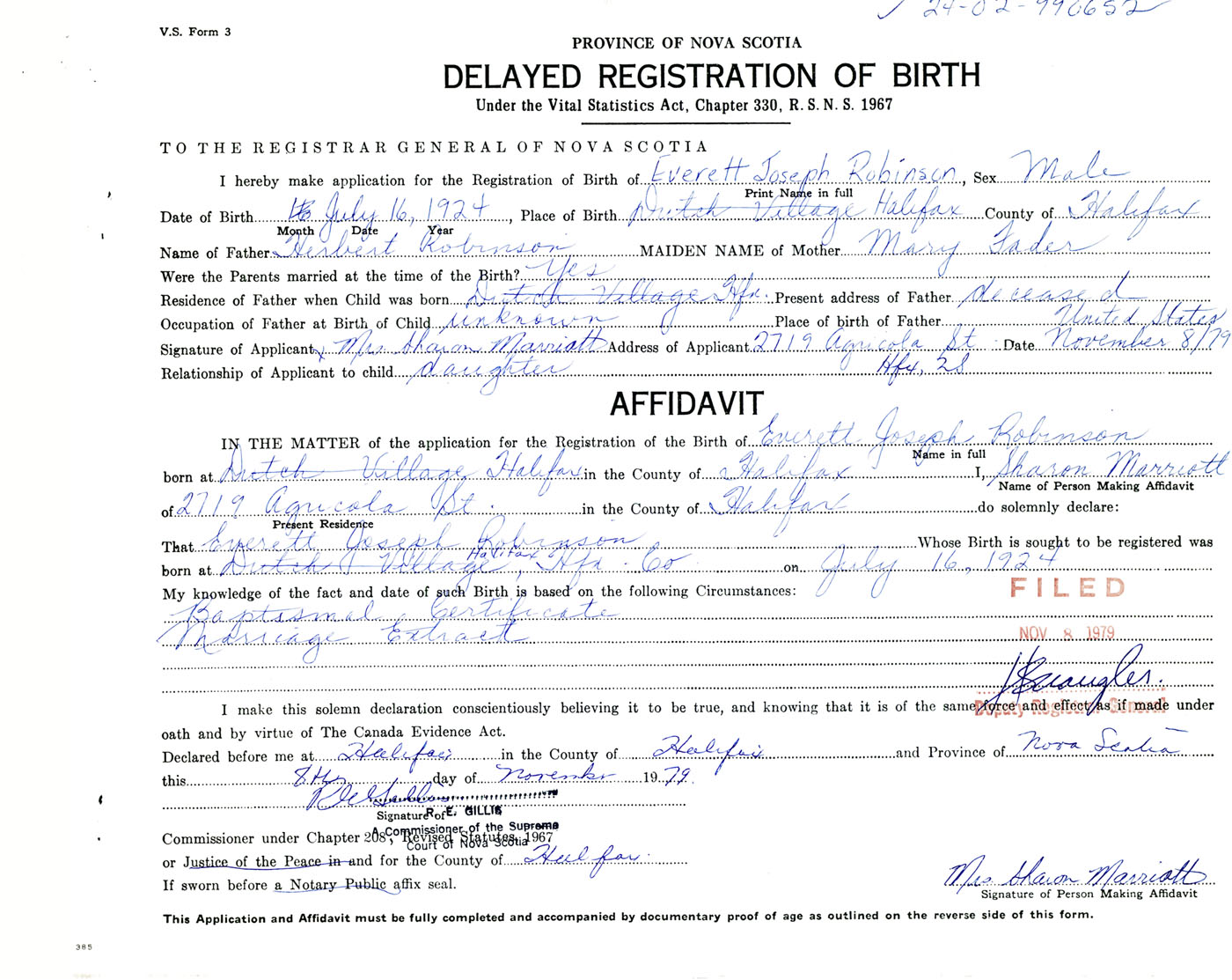 Signature of Applicant Mrs. Sharon Marriott Address of Applicant 2719 Agricola Street, Halifax, NS Date 8 November 1979