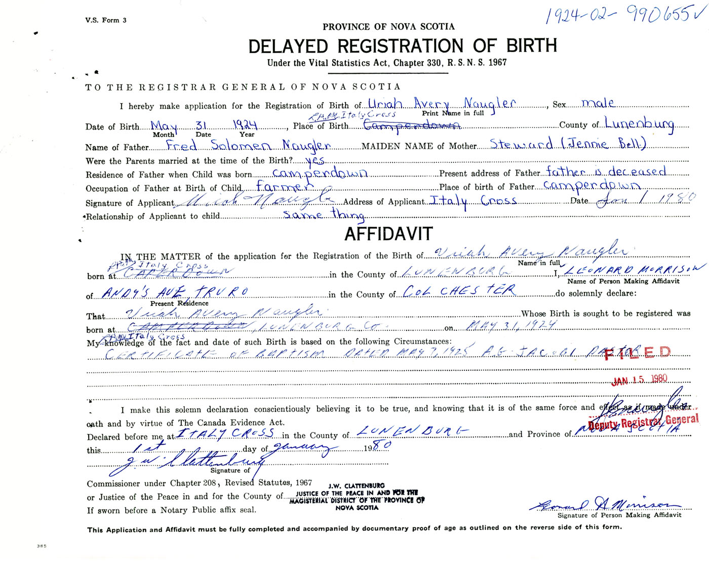 Signature of Applicant Uriah Naugler Address of Applicant Italy Cross, Lunenburg Co., NS Date 1 January 1980