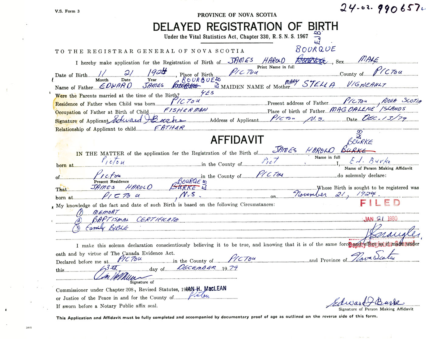 I hereby make application for the Registration of Birth of James HaroldBourque Sex Male