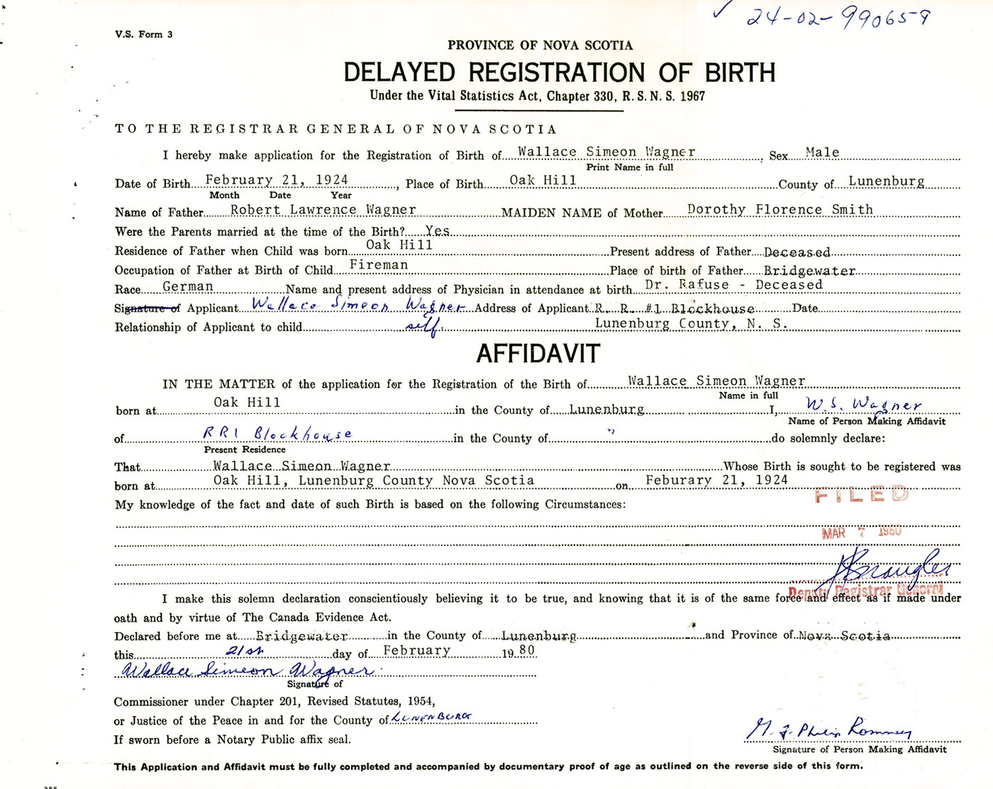 Signature of Applicant Wallace Simeon Wagner Address of Applicant RR #1, Blockhouse, Lunenburg Co., NS Date February 1980