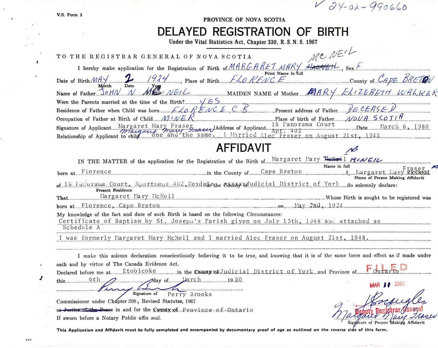 Certificate of Baptism by St. Joseph's Parish given on July 13th, 1948 and attached as Schedule A I was formerly Margaret Mary McNeil and I married Alec Fraser on August 21st, 1948