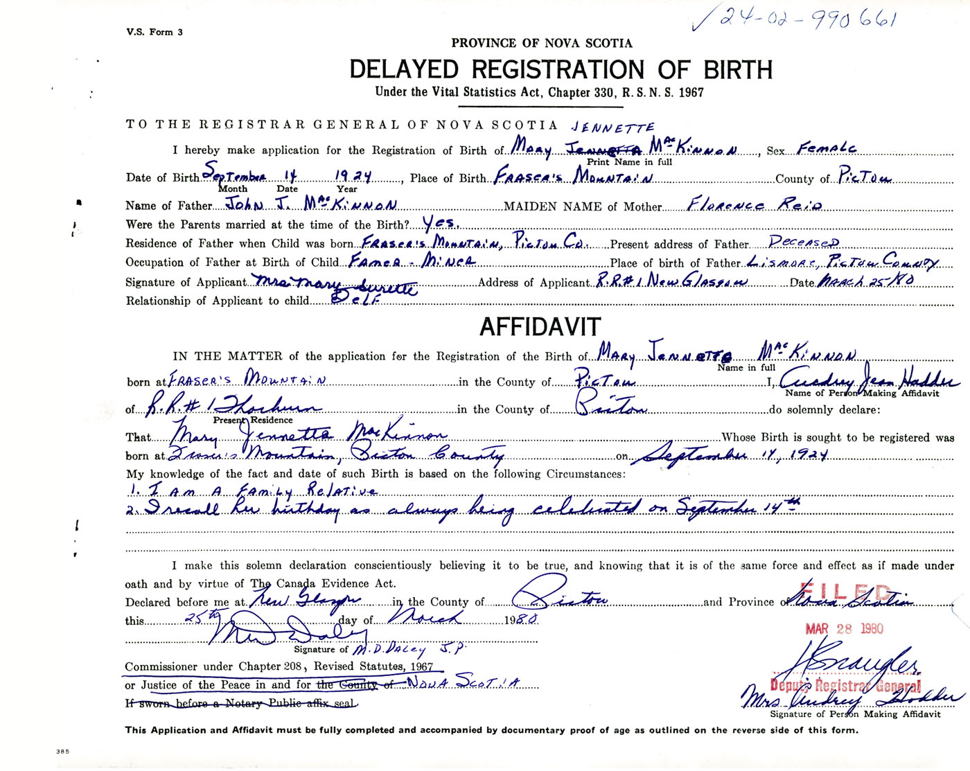 IN THE MATTER of the application for the Registration of the Birth of Mary JennetteMacKinnon
