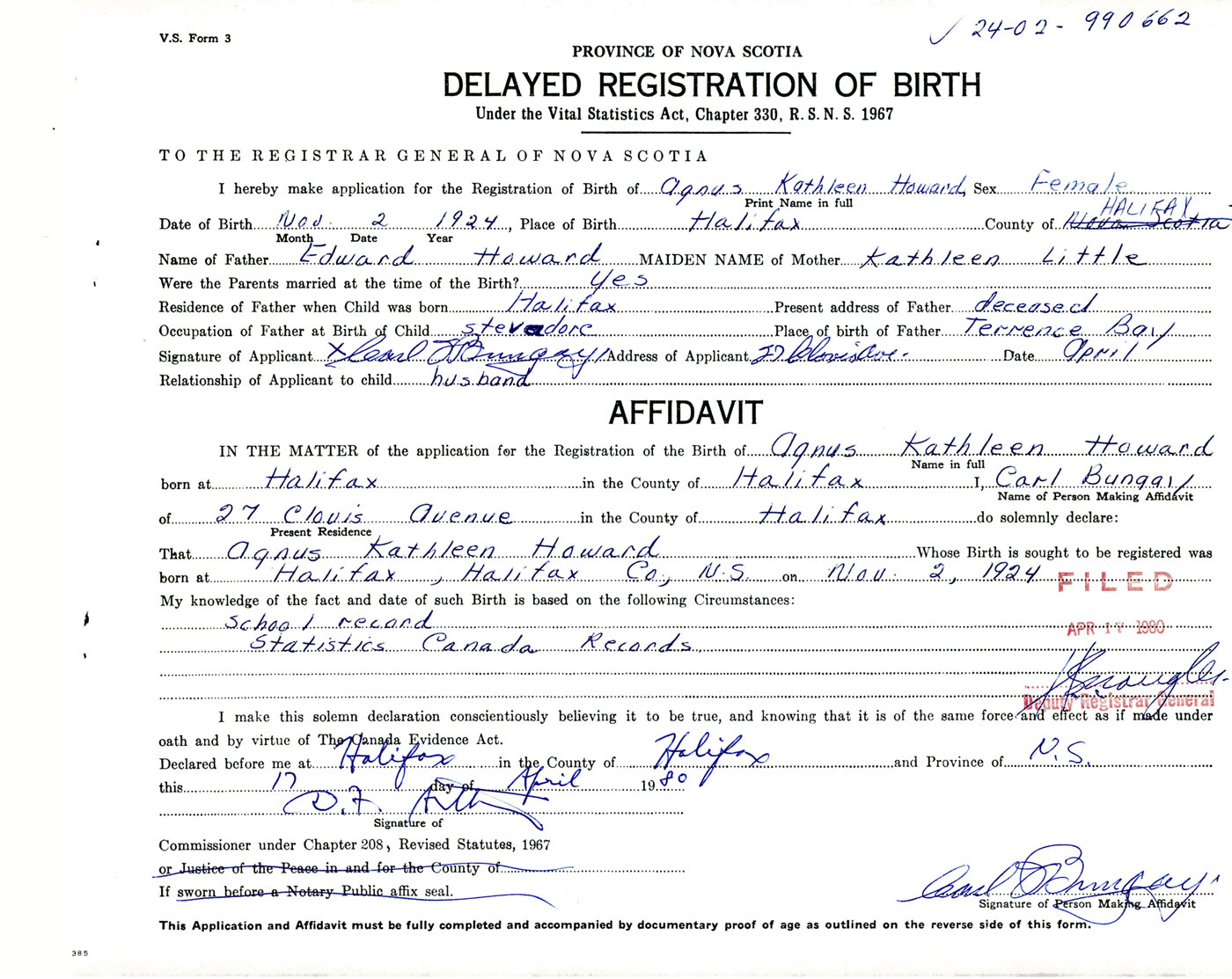 I hereby make application for the Registration of Birth of Agnes KathleenHoward Sex Female