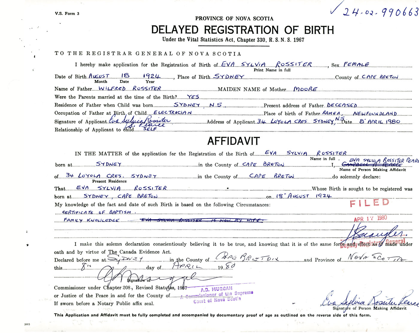 Signature of Applicant Eva Sylvia Rossiter Address of Applicant 34 Loyola Crescent, Sydney, Cape Breton Co., NS Date 8 April 1980