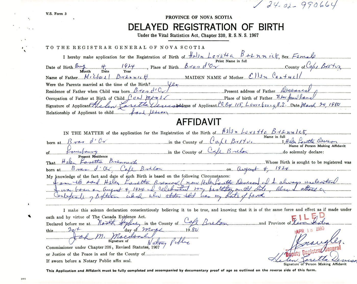 I am the said Helen Loretta Brennick (now Helen Loretta Deveson) and I always understood I was born on August 4, 1924and celebrated my birthday on that date. Also, I attached a certificate of Baptism which also states that was by date of birth