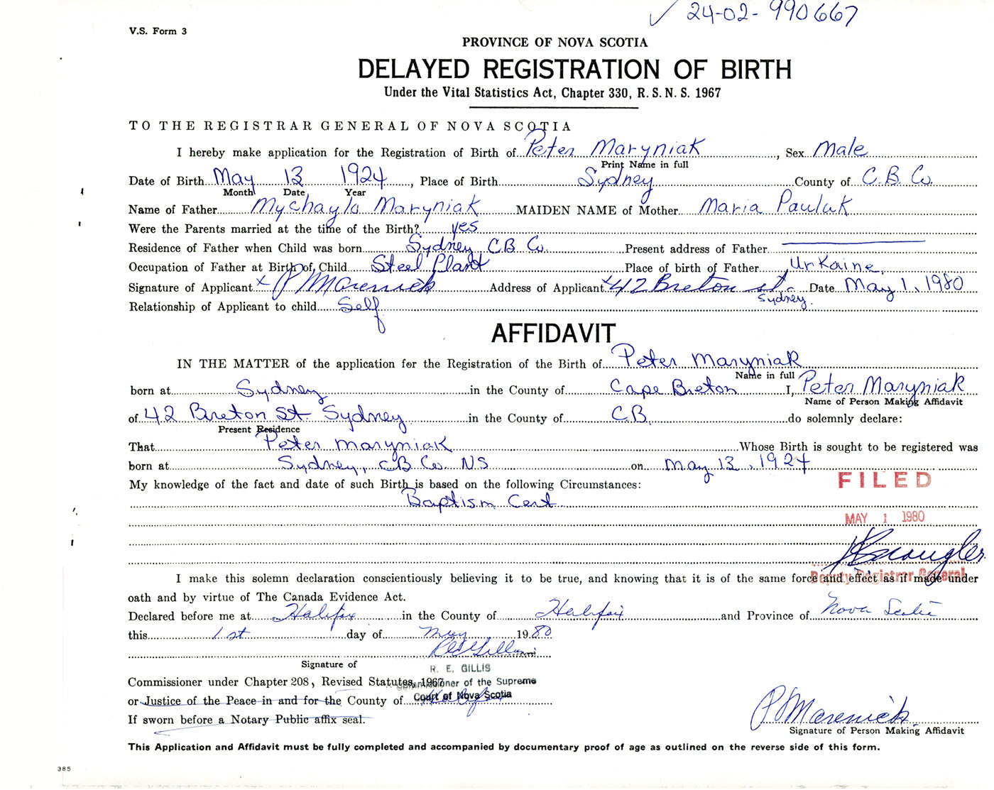 Signature of Applicant P. Maryniak Address of Applicant 42 Breton Street, Sydney, Cape Breton Co., NS Date 1 May 1980