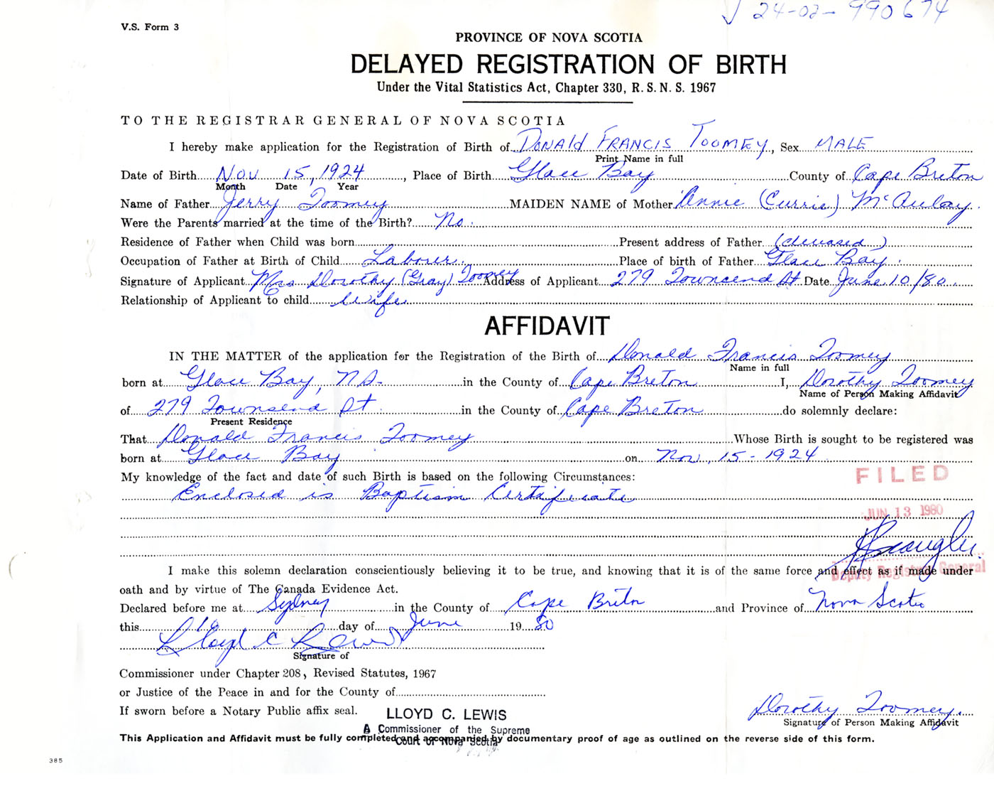 Signature of Applicant Mrs. Dorothy (Gray) Toomey Address of Applicant 279 Townsend Street, Glace Bay, Cape Breton Co., NS Date 10 June 1980