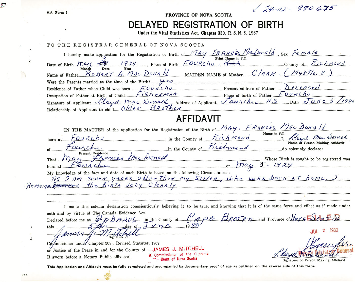 I hereby make application for the Registration of Birth of May FrancesMacDonald Sex Female